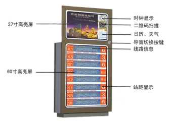 “智能公交電子站牌”是一款公交智能化產(chǎn)品,解決了以往乘客等待公交時(shí)的盲目與無聊。電子站牌不僅可以直觀告訴乘客:等候的公交車離本站還有多遠(yuǎn),還可以提供實(shí)時(shí)文字或視頻節(jié)目供等候乘客觀看,諸如智能控制線路顯示信息、公共信息、公交改造信息、廣告信息等,自動(dòng)校準(zhǔn)時(shí)間、天氣、車輛到站信息等,做到了真正意義上的智能公交電子站牌。充分體現(xiàn)了城市公交的智能化。