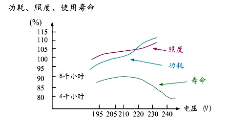 氣體放電燈的照度、功耗、壽命與電壓的關(guān)系曲線