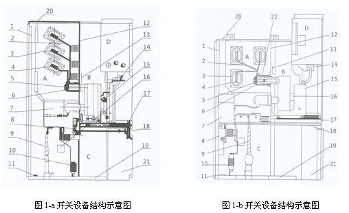 A.母線室 B.斷路器手車室 C.電纜室 D.繼電器儀表室 1.外殼 2.分支母線 3.母線套管 4.主母線 5.靜觸頭裝置 6.觸頭盒 7.電流互感器 8.接地開關(guān) 9.電纜 10.避雷器 11.接地母線 12.裝卸式隔板 13.隔板(活門) 14.二次插頭 15.斷路器手車 16.加熱裝置 17.可抽出式水平隔板 18.接地開關(guān)操作機(jī)構(gòu) 19.底板 20.泄壓裝置 21.控制導(dǎo)線槽